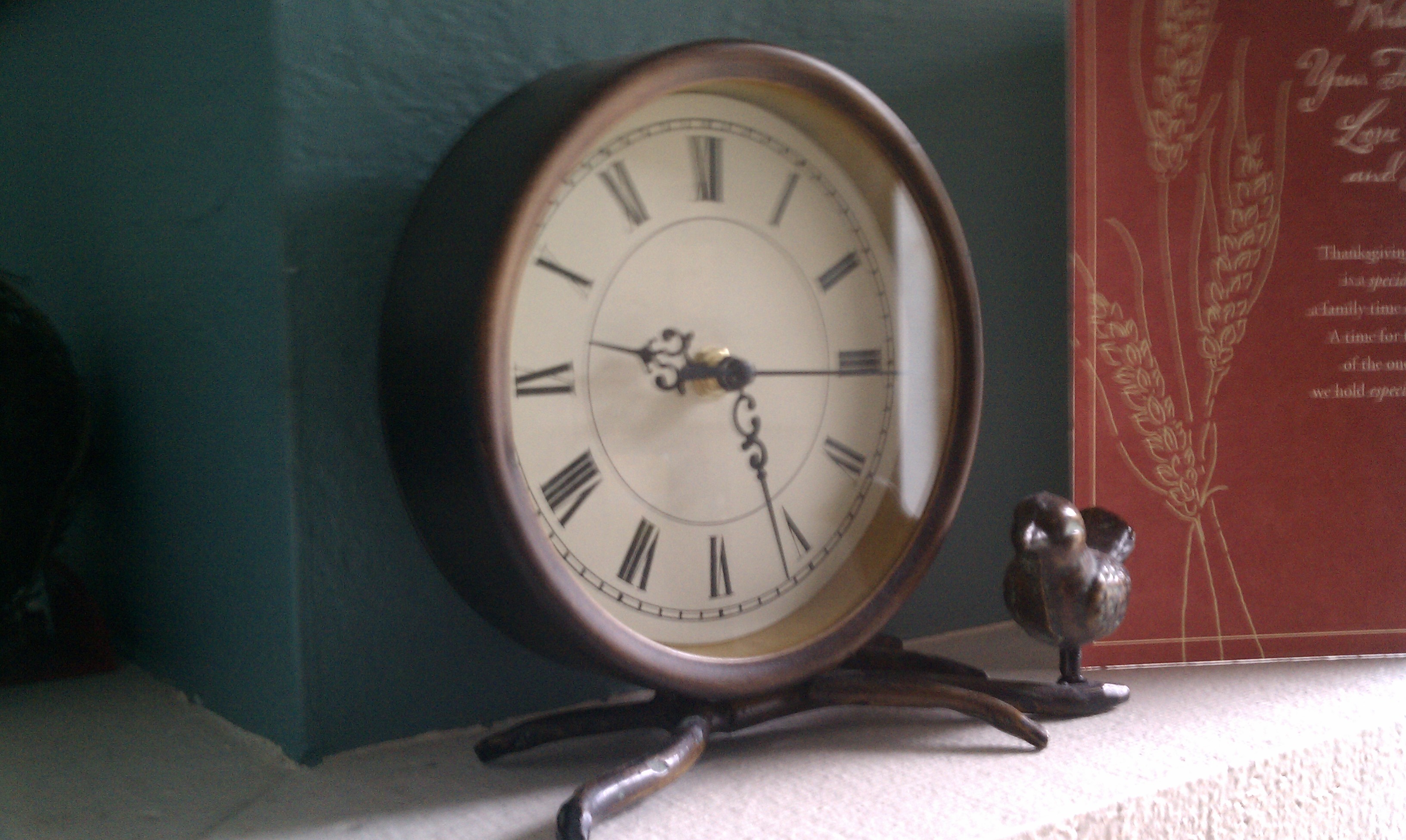 It’s a gift from my mother. She bought it after a holiday décor-seeking mother-daughter shopping trip to our local Pier1. I saw it and fell in love, because it matched the side table with the wrought iron birds in the base that I’d giddily bought months earlier to help me feel nested in our brand new (to us) townhome. The clock cost $15, and I couldn’t afford it. It was a want, not a need, and I was being good. That Christmas season – one in which we’d promised to exchange no gifts and donate to charity instead – my mother presented me with the clock she’d seen me sighing over months earlier. Not a Christmas gift, she insisted, an ‘I love you’ gift. It cost $15, but to me it may as well have been $10,000, because she’d remembered.