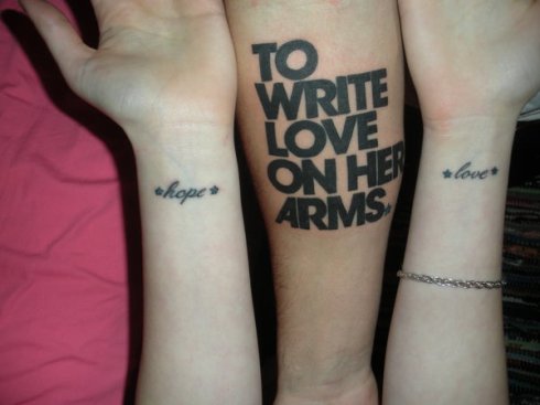 To Write Love on Her Arms is a non-profit movement dedicated to presenting hope and finding help for people struggling with depression, addiction, self-injury and suicide.  TWLOHA exists to encourage, inform, inspire and also to invest directly into treatment and recovery.