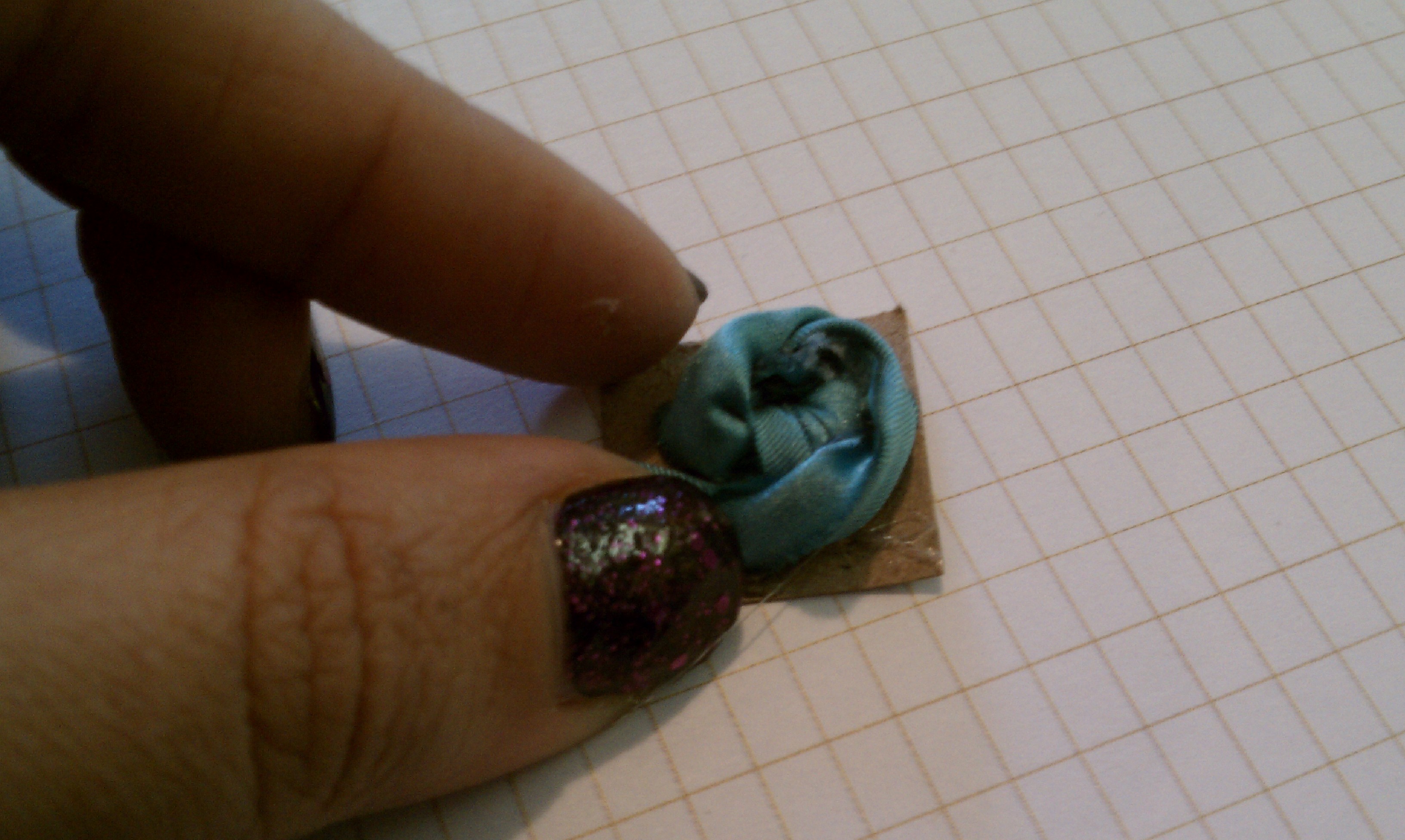 Take one of the reserved leaves and cut it into small squares, one for each flower. I made mind between 1/2 inches and 1 inch, since I wanted different sized flowers. Make a knot on one side of your ribbon, as close to the edge as possible. Put a dab of glue on your cardboard square and glue down your knot, tucking the loose end under.