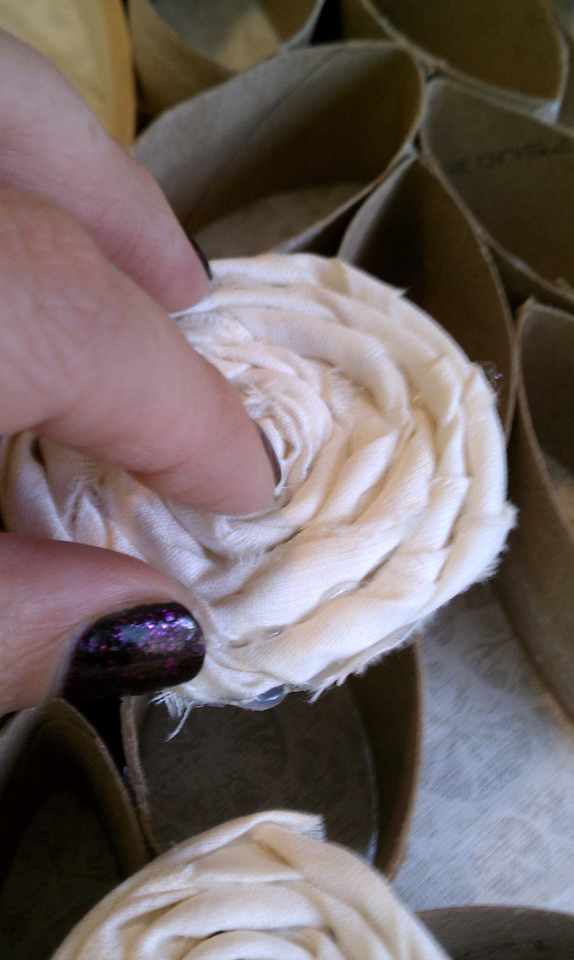 Continue to twist and glue in this manner, adding glue on the edge of the flower when you run out of cardboard to glue on. (Your flower should be larger than your cardboard so it’s not visible from the top.)