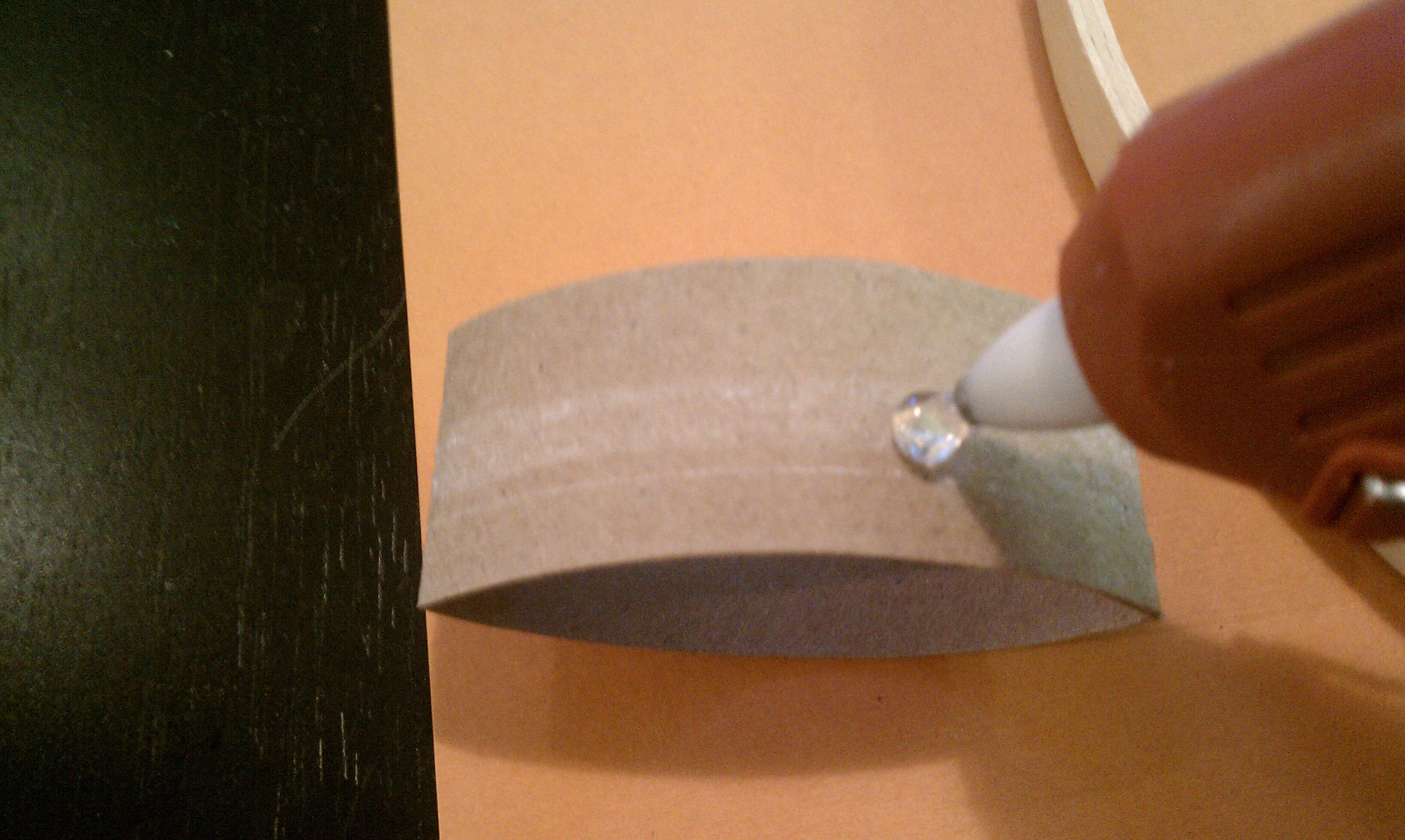 Take your hot glue gun and put a small lump of glue on one paper leaf, about 3/4 of the way down from one of the folded ends.