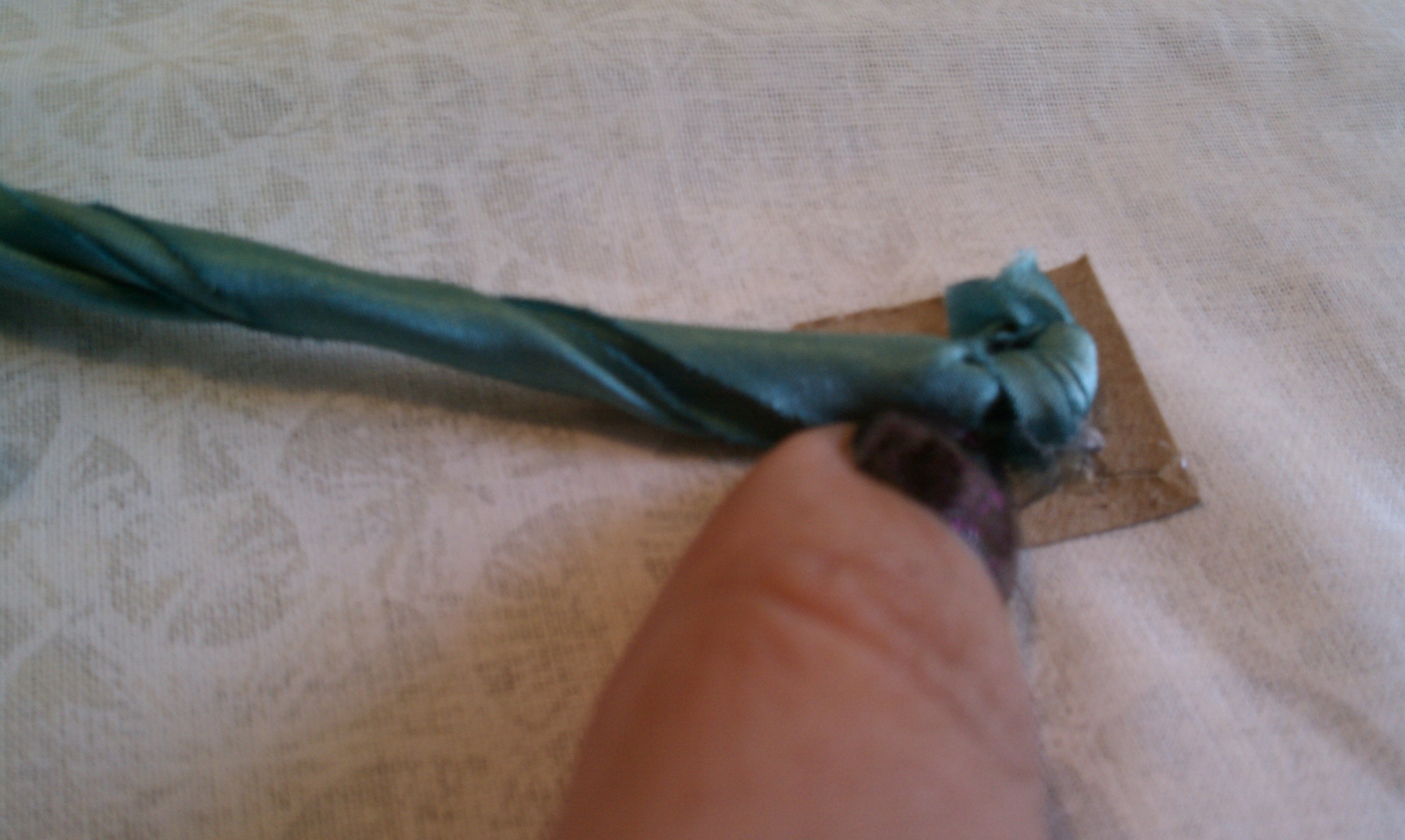 Holding down your cardboard square, twist a few inches of your ribbon into a cord. Make the twist a little tighter than you want your flower to be, as it will untwist a bit as you form your flower.