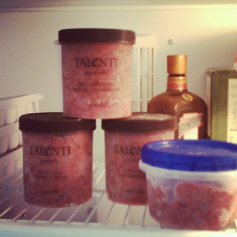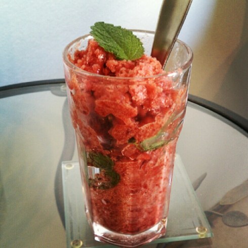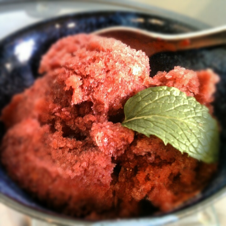 Granita is kind of like a shaved ice for grown-ups. It’s what people like me who are sadly without ice cream makers make to suspend the taste of juicy fruit before the bounty of summer is over. Sadly I don’t have step-by-step pictures of the process because I was doing about ten things at once while I made this (including crossing some things off of The List…stay tuned!) But trust me, it’s as easy as freezing fruit. Because that’s basically all you do.